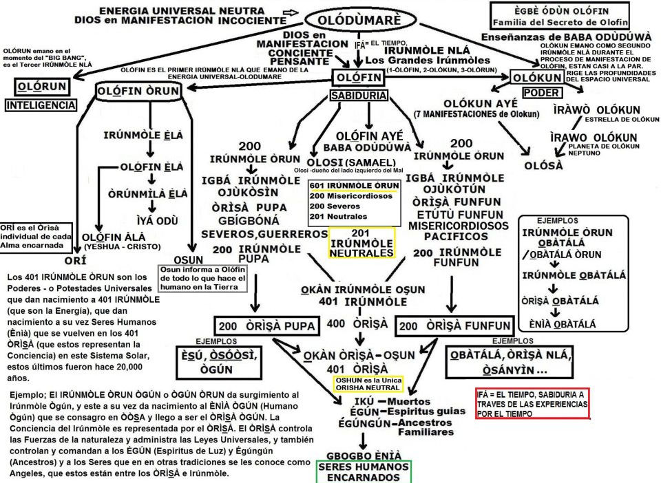 Aqui les comparto algo que prepare de lo que hemos recibido directamente de Baba Oduduwa y de su Emisario espiritual, Egun -Tata G:. y lo que he comprendido, sobre el diagrama del Genesis Yoruba. He notado que han salido preguntas sobre el diagrama, y tratare de explicar hasta donde conosco, lo demas vendra luego, tambien pongo un diagrama mejorado con mayor explicacion y otros detalles de la Creacion.